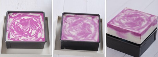 3.8寸活底方模一只:把拌好的兩種液一起倒入,倒入的方式隨意,看想要什么效果。如果想要規(guī)矩的分層效果,則需要倒入一個(gè)顏色冷藏凝固后再倒入另外的顏色。最后入冰箱冷藏至少4小時(shí)以上。吃時(shí)取出,用熱毛巾捂一下四周,自動(dòng)脫模。切時(shí)用熱刀