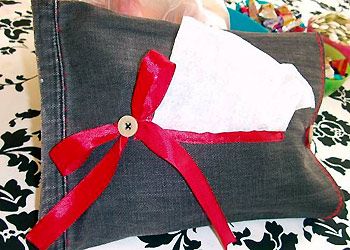 有些朋友喜歡牛仔布料的質(zhì)地,也可以試試,完成后中間打個(gè)紅色蝴蝶結(jié)作為點(diǎn)綴,效果也很不錯(cuò)。