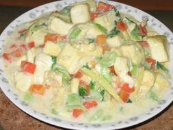 奶汁豆腐 【主料】 豆腐1塊,牛奶25克,胡蘿卜、油菜葉各10克。 【輔料】 花生油25克,水淀粉、精鹽、味精、姜絲、鮮湯各少許。 【制作方法】 ①將胡蘿卜、油菜葉分別切成1.3厘米見方的丁和片。 ②將豆腐放入沸水鍋內(nèi)燙透,撈出過涼,也切成1.3厘米見方的丁。 ③將炒鍋置火上燒熱,放入底油,油熱下豆腐丁,煎呈黃色時,下入姜絲,添入牛奶和鮮湯,加入精鹽、味精燒沸后,轉(zhuǎn)小火加蓋慢燉,至水乳交融,奶香四溢時,轉(zhuǎn)旺火,加入燙過的胡蘿卜丁,油菜葉片,用鍋鏟推勻后,用水淀粉溝薄欠,盛入盤內(nèi)即可。 【特點(diǎn)】 軟嫩適口,有奶油清香,營養(yǎng)豐富。 【制作關(guān)鍵】 要先把鍋燒熱,再放油,這樣煎豆腐不粘鍋。 |