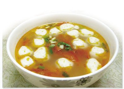 3.把番茄放入肉湯內(nèi)煮,加入番茄醬調(diào)味,再將蒸好的魚丸放入肉湯內(nèi)煮沸即可食用。