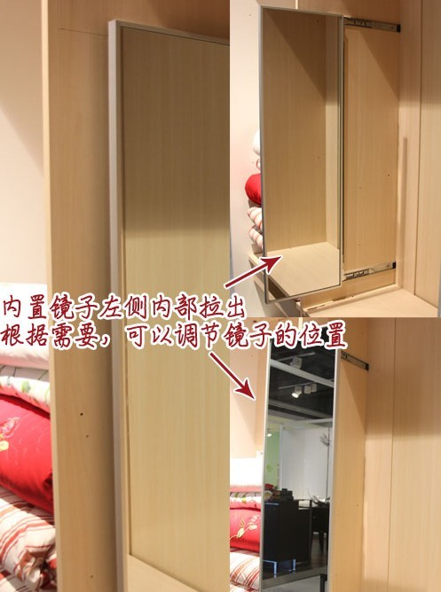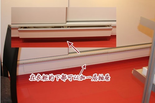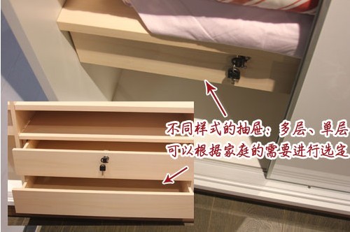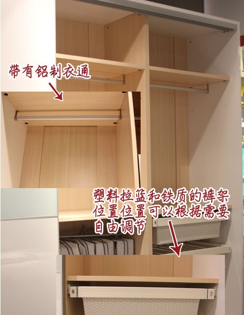 如果您覺得衣柜中放置小物品的地方有些少,沒有關(guān)系,導(dǎo)購員告訴小編,在衣柜的下部可以加一層抽屜,并且衣柜內(nèi)部的板可以調(diào)節(jié)位置,也可以根據(jù)自身的需要加板,加衣通,加抽屜。有些朋友如果不喜歡拉籃、褲架,也可以選擇在購買時(shí)不購買這些。