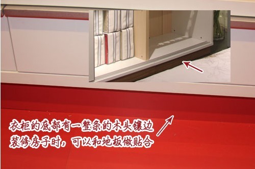 讓您覺得更不可思議的地方是,在衣柜的底部有一整條的木頭鑲邊,在裝修房子時(shí),可以和地板做貼合,有一種嵌入在墻中的感覺。