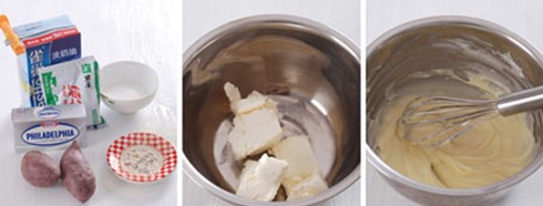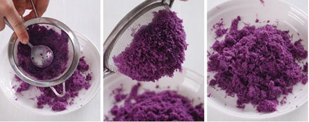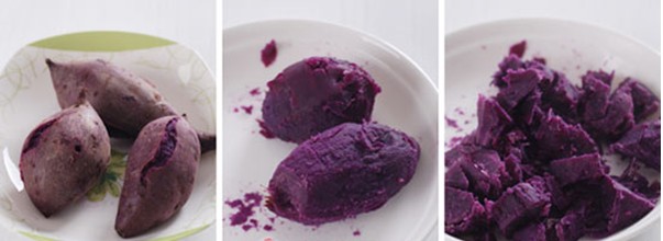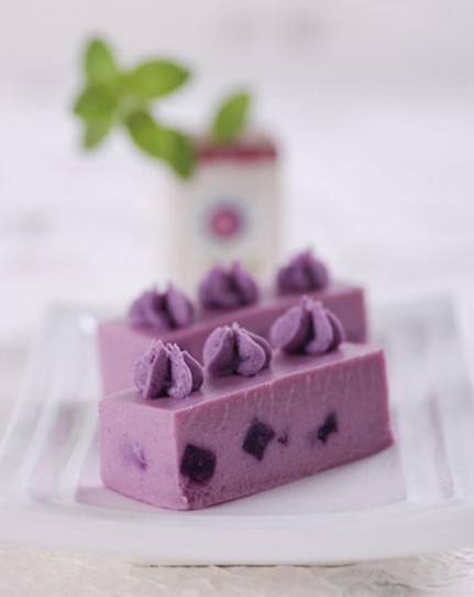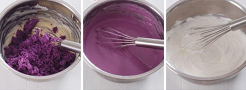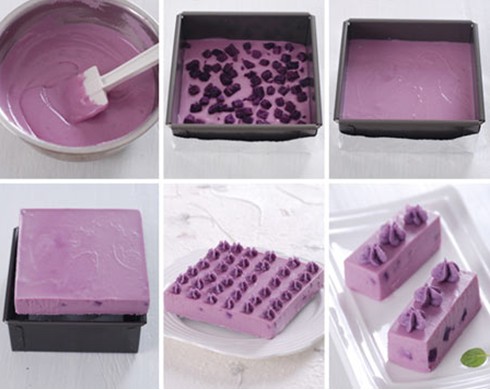 紫薯凍芝士(8寸活底方模,15*15cm) 原料:奶油奶酪125g、白砂糖50g、紫薯泥150g、熟紫薯丁60g、吉利丁片1片(5g)、牛奶50+30g、淡奶油130g。 做法: 1、紫薯蒸熟去皮切開(kāi),趁熱過(guò)篩壓成泥,方法見(jiàn)文末。一部分切丁,備用。吉利丁片涼水中泡軟,瀝干加入30g牛奶中,隔熱水融化。奶油奶酪隔熱水軟化,加白砂糖打至均勻無(wú)顆粒狀態(tài); 2、加入壓好的紫薯泥,拌均勻后加入牛奶,拌勻,加入融化的吉利丁牛奶液拌勻。淡奶油打至6-7分發(fā),還可流動(dòng)的濃稠狀態(tài); 3、加入到拌好的紫薯奶酪糊里拌勻即可。活底容器,我包了一層錫紙,其實(shí)后來(lái)發(fā)現(xiàn)不包也可以。倒入一半的奶酪糊,撒一層紫薯塊,再倒上剩余的奶酪糊。稍微抹平一下表面。入冰箱冷藏4小時(shí)以上; 4、脫模時(shí)可以把模子放在細(xì)高杯子上,然后用吹風(fēng)機(jī)吹四周,或者用熱毛巾捂一下,模具自然就滑落了。最后可以再隨意裝飾一下。切時(shí)用熱刀。