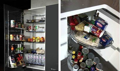 灶臺下方的因為靠近火爐,溫度偏高,無法存放食物。如果在櫥柜中設置一個能自動拖出的拉籃,既可以在遠離火爐儲放食物,一些操作時會用到的鍋具、碗盆類用品也可以放在這里。 |