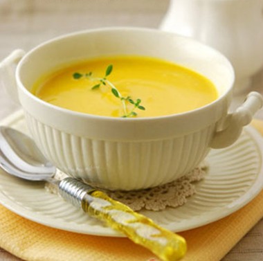 原料: 南瓜半個(gè)約150克、淡奶油50ml、百里香1支、蜂蜜10ml。 做法: 1、小號(hào)南瓜半個(gè),去籽; 2、削掉南瓜皮后切成小片; 3、把切好的南瓜片放入小鍋中,加入清水,沒過南瓜即可; 4、打開火,放入一支百里香同煮; 5、煮到南瓜軟爛后關(guān)火冷卻放涼; 6、把放涼的南瓜連湯一起倒入攪拌機(jī)內(nèi)打碎制成南瓜湯,調(diào)入淡奶油和蜂蜜即可食用;