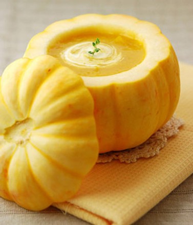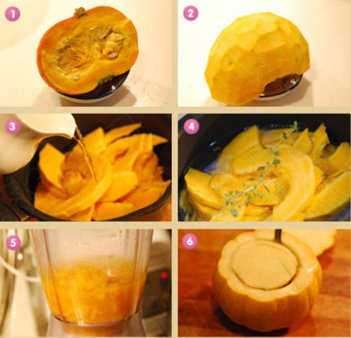 7、如制作南瓜盅,可以取小號(hào)南瓜挖掉內(nèi)芯,倒入南瓜甜湯即可完成裝飾。