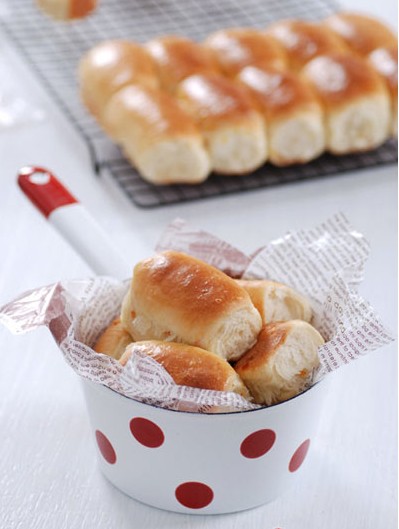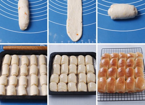 原料: A:金像高粉350g、低粉100g、牛奶+2個(gè)雞蛋共300g、淡奶油50g、糖80g、鹽4g、酵母4g; B:黃油50g、糖漬橙皮100g。 做法: 1.把材料A揉至具有擴(kuò)展性,加入材料B中黃油繼續(xù)揉至可以拉出大片透明薄膜; 2.加入糖漬橙皮揉兩三分鐘至均勻即可。然后餳10分鐘(冬天可以餳30分鐘),分成均勻的20塊; 3.取一份,撮成長(zhǎng)條狀,然后搟開,卷起; 4.排入25L烤盤,至溫暖濕潤(rùn)處發(fā)酵至兩倍大,刷一層蛋液?鞠漕A(yù)熱180度,中層,25分鐘。