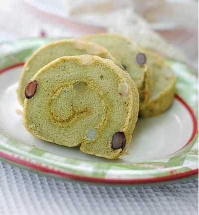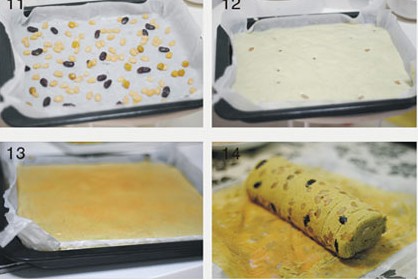 9、將拌好的抹茶糊加入到蛋白糊中; 10、翻拌均勻; 11、烤盤鋪油紙,均勻的撒上蜜豆; 12、將蛋糕糊倒在烤盤上,用力震兩下以震滅大氣泡; 13、烤箱中層180度烘烤20分鐘; 14、卷成蛋糕卷即可(有的人說用搟面杖來輔助卷蛋糕卷,我從來沒用過,我都是直接用油紙包著卷的,反而讓我用搟面杖我倒不會(huì)了,卷的方法和卷壽司一樣)。