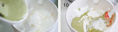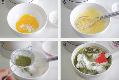 原料:低粉90克、玉米粉10克、水100克、色拉油70克、雞蛋5個(gè)、糖40克、蜜豆適量、抹茶粉10-20克。 做法: 1、材料:低粉90克,玉米粉10克,水100克,色拉油70克,雞蛋5個(gè),糖40克,蜜豆適量,抹茶粉10-20克(替換等量面粉); 2、蛋白加白醋打發(fā)到魚眼泡狀態(tài)加10克白糖; 3、打發(fā)到細(xì)膩紋路時(shí)再加10克白糖; 4、打發(fā)到出現(xiàn)紋路時(shí)再加10克白糖,直到打發(fā)到出現(xiàn)彎曲的小尖角即為濕性發(fā)泡狀態(tài); 6、再加牛奶和色拉油攪拌均勻; 7、篩入低粉和抹茶粉攪拌均勻; 8、將打發(fā)好的三分之一蛋白糊加入到抹茶蛋黃糊中,翻拌均勻;