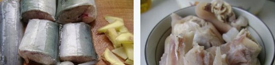 3、鍋入小量油先將鰻魚姜片炒5分鐘,放入 一點酒,加水煮開; 4、將煮開的水倒入砂鍋,放入豬腳,燉至豬腳熟爛就好(筷子能撮穿豬腳就可以);