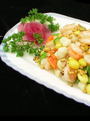 2、將一個(gè)蛋清、蝦仁、魷魚(yú)絲加鹽、味精,加少許淀粉拌勻。