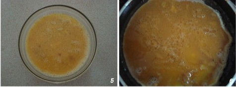 6、煎鍋下油燒熱,用勺子勺入蛋液;