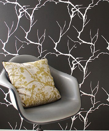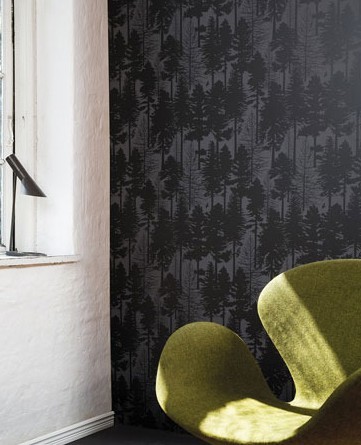 與上一款的對比色運(yùn)用不同,此款松樹主題的壁紙則選用由灰到黑的漸變色彩,運(yùn)用于窗口邊等有一定陽光投射的空間里,就不會產(chǎn)生陰暗的消極作用。