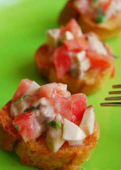 材料:法棍、西紅柿、鮮口蘑、洋蔥、香菜。 調(diào)料:黃油、酸奶酪沙拉醬 做法: 1、西紅柿、鮮口蘑、洋蔥、香菜分別洗凈,西紅柿、鮮口蘑、洋蔥切半公分見方的小塊(呵呵,個別筒子別又拿尺子量。。,香菜切碎。 2、將切好的材料混合均勻放入保鮮盒入冰箱冷藏一下。 3、將法棍斜切成厚片,一面涂上黃油,置烤箱中,涂黃油的一面朝上,180度,烤7分鐘取出。 4、將2中的材料拿出,加入酸奶酪沙拉醬拌勻,分別置于法棍片上,擺盤即可。