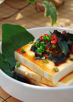 材料:內(nèi)脂豆腐、皮蛋、紅椒、香蔥、(要是有一點(diǎn)干果碎更好)。