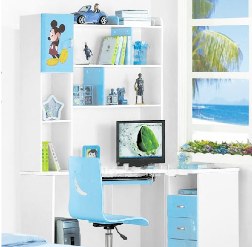 推薦理由:藍色與白色的搭配展現(xiàn)了男孩野性的一面,也保留了他溫柔善良的一面,恰當?shù)纳蚀钆鋼Q來清新的視覺效果。書桌采取轉(zhuǎn)角設計,節(jié)省空間,充分利用角落位置,也增大了書桌的使用范圍,同時滿足你三個愿望。收納架構豐富,可以按喜好擺放物品。
