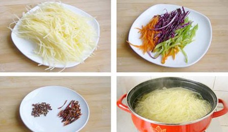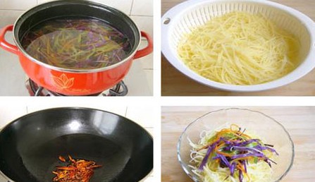 原料:土豆2個(gè)、尖椒1個(gè)、紫甘藍(lán)1片、胡蘿卜1根、干辣椒、花椒、生抽、白糖、鹽、醋、味精、香油。 做法: 1、將土豆洗凈去皮,再用清水沖洗干凈; 2、土豆切成細(xì)絲,不要夸我切的絲啊,那是用擦菜的工具擦的; 3、將切好的土豆絲放到淡鹽水里浸泡一下,洗去多余的淀粉; 4、尖椒、紫甘藍(lán)、胡蘿卜切絲; 5、鍋里放水燒開,水開后下入土豆絲焯熟,撈出來放到冷水里過涼; 6、尖椒、紫甘藍(lán)、胡蘿卜絲焯熟; 7、鍋里放油燒熱,關(guān)火后放入花椒、辣椒炸出香味; 8、土豆絲上放生抽、糖、醋、適量鹽,將炸好的辣椒油倒在土豆絲上,再滴上幾滴香油拌勻即可。