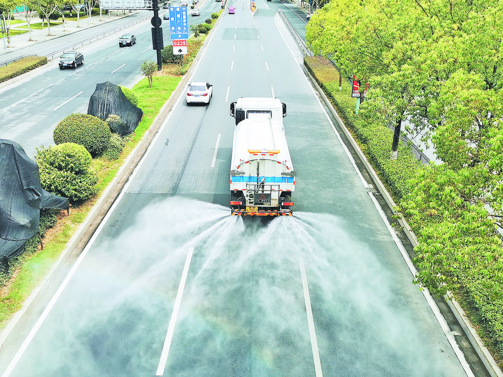 圖為灑水車在路面開展機(jī)械作業(yè)。