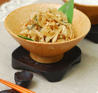 原料: 青菜(北京稱為油菜)或者大白菜(取幫子部分)、鹽、芥末籽、糖、醋、香油。 做法: 1、將青菜或大白菜,過開水一焯即起(大白菜要撕開成片再焯); 2、將青菜或大白菜串起,放在陰涼通風(fēng)處,風(fēng)干(秋冬季約二十天); 3、將風(fēng)干后的青菜或大白菜改刀成粗絲,洗凈,涼景晾干水,置于大盆中; 4、將芥末籽用搟面杖壓碎,與鹽、糖、醋、香油(我舅說,要是喜歡帶色兒的可以加點(diǎn)醬油),一起放入盆中; 5、將盆中的材料充分揉搓均勻; 6、取消毒過的容器(最好取用過的醬小菜瓶子,這樣吃一瓶開一瓶,能保證不變質(zhì))將菜塞入壓實(shí),密封好瓶口,放于陰涼處,二十天后可食! |
