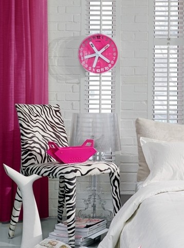 甜美味十足的粉色鐘表 狂野味十足的斑馬紋座椅和白色床品形成鮮明對比,如果覺得太過粗獷,不妨給墻面掛一款甜美味十足的粉色鐘表,會(huì)給臥室增添幾份柔美氣息。