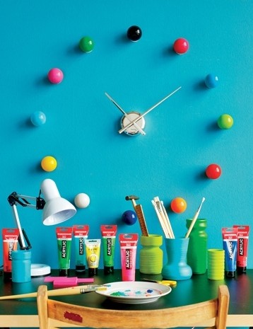 12個(gè)時(shí)間刻度用12種不同顏色的小圓球代表,看上去就像彩虹糖果,挑逗你的味覺。這款鐘表省去了表盤,讓刻度在天藍(lán)色的墻體上形成圓形的圖案,充滿活力。