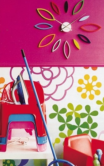 用青春亮麗的色彩,以及充滿可愛花朵的圖案或者鐘表造型,營造出一種輕松甜美的風(fēng)格,搭配非常卡通的室內(nèi)家具,形成很典型很別出心裁的女孩子兒童房的空間效果。
