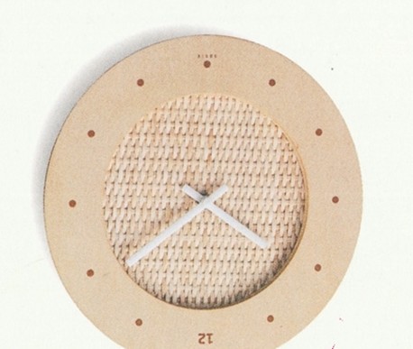 木質(zhì)和竹皮編織掛表 采用木頭作為鐘的外框,鐘的表盤采用了編織的竹皮材料,整個掛鐘為原木色,符合樸素家居的生活特點。