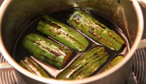 注:1大匙=15毫升=1 Tablespoon,1茶匙=5毫升=1 Teaspoon,1杯=240毫升。 器具:干凈玻璃瓶一個。 做法: 1、小黃瓜洗凈切去頭尾(圖1),一切兩段; 2、鍋中放入白醋1/2杯(Pickling vinegar),鹽1茶匙,萬字牌生抽醬油1/2杯,老抽醬油3大匙,糖1杯,置爐上開大火,煮滾。調(diào)中小,分批放入黃瓜燙10-15秒中 ,撈出;