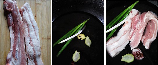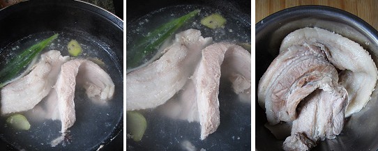 原料:五花肉、蔥、姜、大蒜、白酒、鹽、香油、糖、大料、花椒等。 做法: 1、五花肉清洗干凈備用,蔥切段、姜切片,準備一鍋清水,放入蔥段姜片,一小盅白酒,一顆大料、幾顆花椒,將五花肉放進鍋里,開火煮肉;