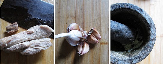 3、大蒜剝皮后清洗干凈,石臼里加入適量鹽,將蒜瓣放進去搗成泥,加入適量味極鮮醬油,少許糖和香油,愛吃辣的加些辣椒油,吃的時候,肉片蘸著蒜泥吃,很清爽。
