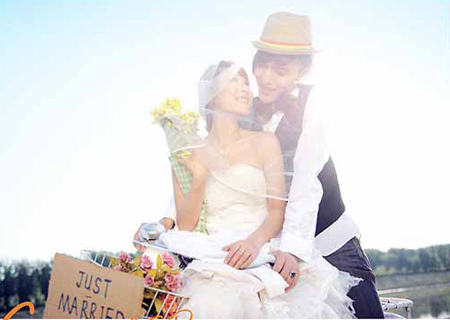 自行車絕對(duì)是彰顯年輕人之間那種小浪漫最好的道具之一啦。在河畔,新娘坐在車梁上的情景讓人想到了發(fā)生在大學(xué)校園里那種純純的愛情。鮮花同樣作為裝飾物很好的點(diǎn)綴了照片,也為照片增加了很強(qiáng)的浪漫色彩。