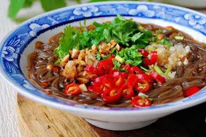 天熱,人也容易沒胃口。怎樣讓煮婦省時(shí)省力,盡可能遠(yuǎn)離高溫油煙的侵襲,還能調(diào)動(dòng)起大家的胃口。當(dāng)然是首選那些有滋味的清涼開胃涼拌菜了。這酸辣蕨根粉堪稱夏天最理想的一道清涼解暑開胃菜,不用開火,吃著涼快,滑嫩爽口、酸辣鮮香,而且由于蕨根有滑腸通便、清熱解毒、消脂降壓、通經(jīng)活絡(luò)、降氣化痰、幫助睡眠等功效,尤其適合夏季食用。高溫桑拿天,大汗淋漓天,別忘了這道清涼解暑開胃菜——酸辣蕨根粉。解放自己,快樂大家! 小米辣、香油、陳醋、香菜、蒜末、花生碎一樣也別少,配菜隨意。沒有小米辣,用點(diǎn)辣椒油也可以。不過有這紅紅的小米辣點(diǎn)綴,這黑乎乎的蕨根粉才更添姿色,更誘人食欲。當(dāng)然,如果不嫌肉貴,加點(diǎn)肉絲啥的,滋味就更美妙了。
