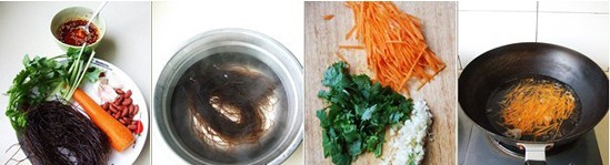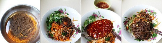 原料:蕨根粉、胡蘿卜、香菜、炒熟花生、蒜、自制麻辣紅油。 做法: 1、蕨根粉用開水浸泡至軟,無硬芯,過一下涼開水,瀝干水分備用; 2、胡蘿卜切絲,焯一下水,過一下涼開水,瀝干水分備用; 3、炒熟花生去皮,搟成粗粒,大蒜拍扁剁碎,香菜切段備用; 4、以上原料混合,添加鹽、糖、生抽、陳醋和味精拌勻; 5、吃時(shí)拌上一勺自制麻辣紅油。