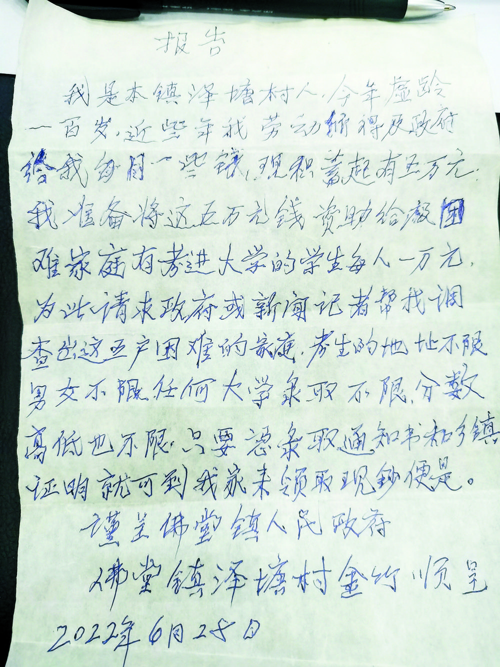 怎么過今年的百歲生日,老人其實是早有“預(yù)謀”的。金竹順小時候很喜歡讀書,但因為父親去世得早,家境困難只得輟學(xué)務(wù)農(nóng)。90歲那年他立下了一個心愿,要存些錢資助家庭困難的學(xué)生,不能讓他們像自己一樣沒有書讀,留下遺憾。 正因為有這樣一個愿望,老人平時很節(jié)儉,幾個兒子給他的錢都存了起來。金竹順年輕時在村里當過守山員,學(xué)會了做掃帚的手藝,閑下來經(jīng)常會做一些掃帚拿去賣。但這些錢,他從沒舍得花。就這樣省吃儉用,老人9年多時間存下了5萬元。 今年6月28日,金竹順來到佛堂鎮(zhèn)政府群眾接待室,遞交了一份他手寫的報告,希望政府幫忙找5名考上大學(xué)的困難學(xué)生,每人資助1萬元。報告寫道:“考生的地址不限,男女不限,任何大學(xué)錄取不限,分數(shù)高低也不限,只要憑錄取通知書和鄉(xiāng)鎮(zhèn)證明,就可到我家來領(lǐng)取現(xiàn)金! “我們馬上聯(lián)系了轄區(qū)內(nèi)的大成中學(xué),選出5名符合要求的學(xué)生,其中4名是義烏人,1名來自外地。他們的家境都比較困難,高考成績都在592分以上!狈鹛面(zhèn)宣傳委員周子卿說,將這5名學(xué)生的情況書面交給老人后,得到了他的認可。 7月5日,金竹順家的小院子里特別熱鬧。5位受資助的學(xué)生和家長都來看望這位善良的老人!澳銈円(jié)約一點,讀書么用功一點,將來做個對社會有用的人!苯鹬耥樢贿叾,一邊將5萬元現(xiàn)金分別裝入5個紅包,交到5名學(xué)生手中。 聽著老人質(zhì)樸的話語,受助學(xué)生都紅了眼!敖馉敔斦f,去年一年他省吃儉用只花了88.5元,感覺這個紅包真的沉甸甸!笔苤鷮W(xué)生何俊凱說,“掃帚爺爺”的善舉,更增添了他學(xué)習的動力。 |