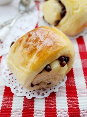 5、分割好的面團分別搟平,加入蜜紅豆后卷起切成小塊;