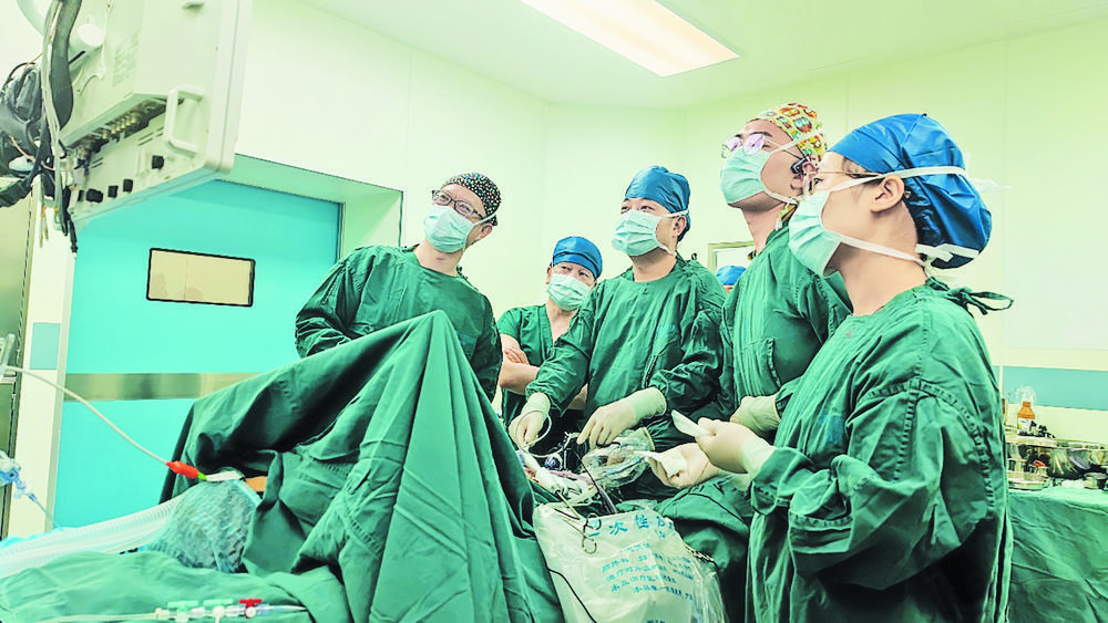 浙大四院副院長唐喆(中)為患者實施手術。 “這么大的手術,肚子上竟然沒有切口,太神奇了!”近日,在浙大四院大腸外科病房,剛經歷腸腫瘤、肝轉移腫瘤聯(lián)合切除手術的王女士對術后恢復狀況十分滿意。 外科醫(yī)生的“極限挑戰(zhàn)” 患者王女士今年63歲,日前因腹部脹痛、伴惡心嘔吐前往浙大四院就診。入院檢查發(fā)現(xiàn),結腸原發(fā)腫瘤占據(jù)腸腔一周,侵犯鄰近腹膜及周圍淋巴結,且轉移到了肝臟,臨床分期為4期。簡單來說,就是腸腫瘤、肝轉移腫瘤都屬于晚期惡性腫瘤,情況非常危險。 “結腸腫瘤雖然已經出現(xiàn)肝轉移,但所幸可以切除!闭愦笏脑捍竽c外科主任王建偉表示。聽到這個消息,王女士一家松了口氣。但得知手術復雜、創(chuàng)傷較大,加上自身對疼痛十分敏感,王女士對手術略顯抗拒,郁郁寡歡。 得知此情況后,王建偉帶領團隊進行多學科討論,決定為患者進行腹腔鏡下結腸腫瘤聯(lián)合肝轉移腫瘤腹部無切口切除術,同時特邀知名肝膽胰外科專家、浙大四院副院長唐喆共同手術,在保證安全的前提下最大限度減少創(chuàng)傷,加速康復。 據(jù)悉,該手術沒有傳統(tǒng)手術的腹壁刀口,而是于腹腔鏡下在腹壁開4至5個小孔實施手術,再由肝膽外科專家進行肝轉移灶切除以及創(chuàng)面止血。聽了手術方案詳細說明后,王女士表示超出自己的預期,立即同意接受手術。最終,在專家團隊共同努力下,手術順利完成。術后,王女士發(fā)現(xiàn)肚子上沒有切口,只有5個小孔,也沒有很明顯的疼痛,表示“真不敢相信自己做了這么大的手術”。 晚期腸腫瘤別放棄 王建偉介紹,手術治療是結腸腫瘤的主要治療方式,絕大多數(shù)早期患者通過手術可達到根治目的。當腫瘤進展到晚期時,仍可通過手術治療減輕體內腫瘤負荷,解除并發(fā)癥,減輕患者痛苦,提高生活質量,延長生存期。 據(jù)悉,此次浙大四院為患者實施的腹腔鏡下結腸腫瘤切除術和經自然腔道取標本手術,這兩個術式都已逐步成熟,但將兩種術式結合一起運用,目前還比較少見。本次手術的成功開展,在彰顯浙大四院外科手術水準的同時,也體現(xiàn)了微創(chuàng)外科理念和加速康復外科理念,以無切口的方式為患者完成手術,減輕術后疼痛,成為廣大患者的福音。 截至目前,浙大四院大腸外科在王建偉的帶領下,每年開展結直腸腫瘤經自然腔道取標本手術100例左右,并成功開展微創(chuàng)超低位直腸腫瘤根治術、盆腔轉移腫瘤聯(lián)合多器官切除、巨大骶骨前腫瘤切除等復雜高難度手術,患者獲得良好生存。 |