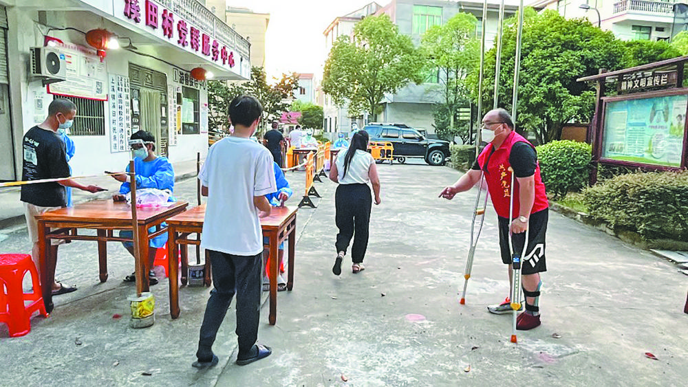 沈永強(qiáng)拄著拐杖堅(jiān)守在核酸檢測(cè)點(diǎn) 8月3日早上5點(diǎn),天剛蒙蒙亮,在上溪鎮(zhèn)溪田村核酸檢測(cè)點(diǎn),陸陸續(xù)續(xù)有村民前來進(jìn)行核酸采樣。遠(yuǎn)遠(yuǎn)地,村民們就能看到一個(gè)身著紅馬甲、拄著拐杖的身影。 “錯(cuò)開點(diǎn),保持距離!贝呓豢矗瓉硎谴妩h支部書記沈永強(qiáng),他左腿腳踝打著厚厚的石膏,拄著雙拐站在一旁,一遍又一遍地叮囑村民戴好口罩,保持安全距離。有村民忍不住打起招呼:“沈書記,你坐下歇會(huì)兒吧! “不小心扭了一下,不要緊的!贝迕裨儐柲_傷時(shí),他總是這樣說。原來,7月16日,沈永強(qiáng)帶領(lǐng)村兩委在大清查(排查有安徽省蚌埠市旅居史的來義返義人員)過程中,在臺(tái)階上不慎扭傷,導(dǎo)致骨折,醫(yī)生叮囑他少走動(dòng),多休息。 沒想到,“8.2”疫情來勢(shì)洶洶。8月2日當(dāng)晚,村兩委所有干部都去增援江東街道,第二天收到要開展全域核酸檢測(cè)的消息時(shí),村兩委只剩下沈永強(qiáng)一人。作為村社“一肩挑”,他強(qiáng)忍著疼痛連夜起床,開始組織布置村內(nèi)核酸檢測(cè)現(xiàn)場(chǎng)、人員安排、疫情防控宣傳、村內(nèi)硬隔離等工作。 溪田村居住著許多外來人口,一整天的辛苦工作后,沈永強(qiáng)受傷的腳踝又開始發(fā)腫、充血,村民和志愿者們都勸他回家好好養(yǎng)傷,沈永強(qiáng)依舊堅(jiān)持在核酸檢測(cè)點(diǎn)維持秩序!艾F(xiàn)在疫情形勢(shì)嚴(yán)峻,我不能置身事外。”沈永強(qiáng)說。 |