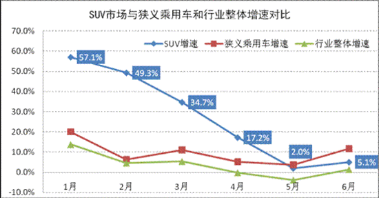 與今年上半年行業(yè)整體市場及狹義乘用車市場的月度銷量增幅與SUV市場進行比較,在行業(yè)整體市場及狹義乘用車市場整體上半年都表現出的低迷狀態(tài)不同的是,雖然出現一路下滑態(tài)勢,但SUV市場的月度增幅是相對較高。雖然6月份,SUV市場的增速低于狹義乘用車市場,但相信這種態(tài)勢不會延續(xù)。
