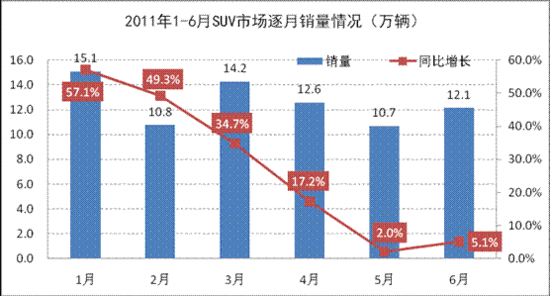 2011年1-6月SUV市場逐月銷量示意圖