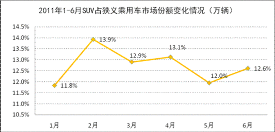 而如果從今年上半年SUV市場所占狹義乘用車市場份額的變化情況來看,SUV所占狹義乘用車市場的份額呈現出較為一個穩(wěn)定的態(tài)勢,穩(wěn)定的維持在最低11.8%以上。而如果從2009年以來的情況看,特別是2010年,SUV市場在整體狹義乘用車市場的份額則是不斷提升的。結合近年來的整體情況,可以說,SUV的市場份額是穩(wěn)中有升。