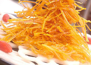 2、紅薯去皮切細(xì)絲,放入油鍋中炸成金黃色撈出;