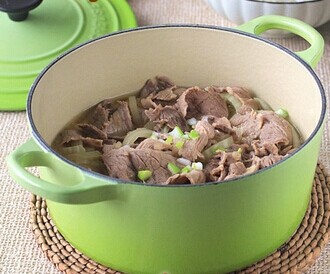 2、鍋里放入日式高湯{做法在這里),沒有就用水代替,加入姜絲、蔥片,煮開后將牛肉一片一片分別入鍋,燙至變色即撈起;