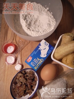 主料:黃油60克, 砂糖80克, 雞蛋1個(gè), 低筋面粉120克, 小蘇打1/2小勺, 泡打粉少許, 酸奶80克, 香蕉泥100克, 葡萄干適量,
