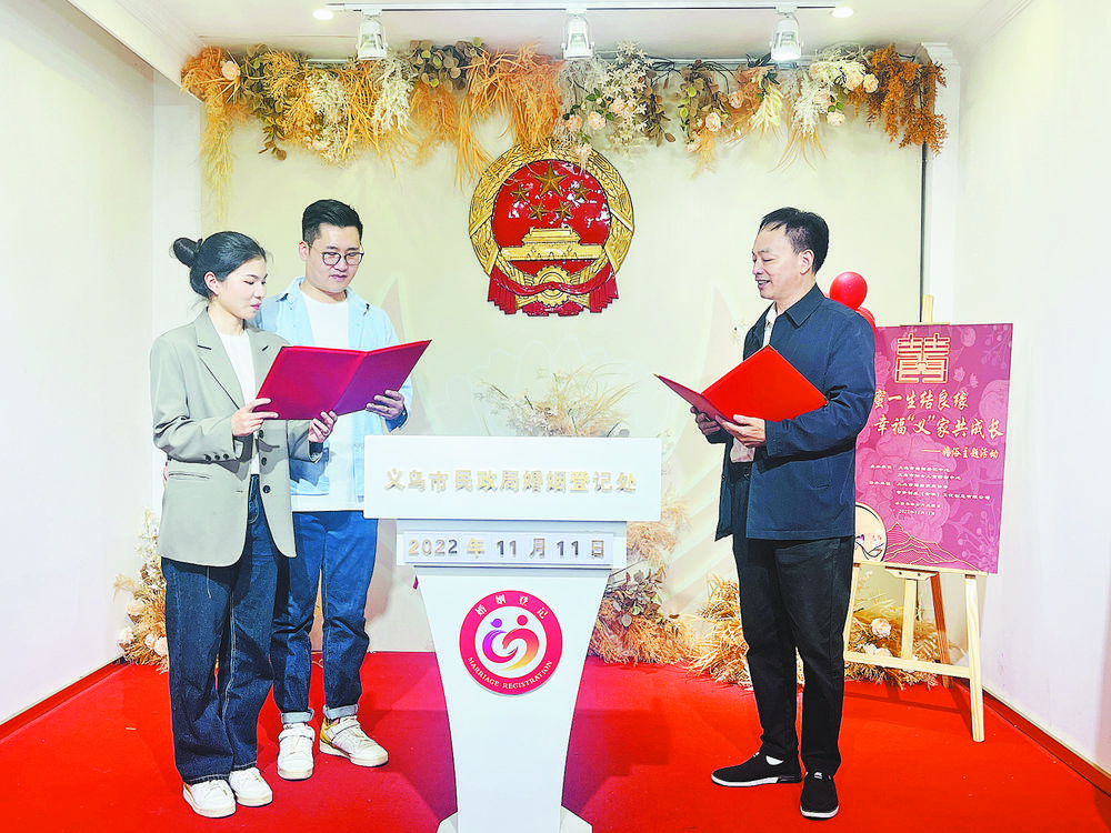 新人在國(guó)徽下宣讀愛(ài)情誓詞 11月11日有著一心一意、一生一世的寓意,很多年輕人會(huì)選擇在這一天辦理結(jié)婚登記。為構(gòu)建簡(jiǎn)約適度的婚俗禮儀,傳遞健康的婚姻價(jià)值觀,培育文明向上的婚俗文化,市婚姻登記中心聯(lián)合市婦女兒童活動(dòng)中心,在當(dāng)天舉辦了“甜蜜一生結(jié)良緣·幸!x’家共成長(zhǎng)”婚俗主題活動(dòng)。氣球、彩帶和大紅喜字,婚姻登記處到處洋溢著浪漫的氛圍,一對(duì)對(duì)新人按照預(yù)約時(shí)段有序登記。掃碼、測(cè)溫、證件審核、登記頒證……整個(gè)流程便捷高效。 “我們自愿結(jié)為夫妻……上孝父母,下教子女,互敬互愛(ài),互信互勉……”頒證廳內(nèi),新人們?cè)趪?guó)徽下莊嚴(yán)宣誓,特邀頒證嘉賓送上美好祝福后,為新人頒發(fā)結(jié)婚證書(shū)。 “特地選擇今天來(lái)登記,愿我們永遠(yuǎn)不過(guò)‘光棍節(jié)’。”小朱今年26歲,與老公戀愛(ài)兩年半。領(lǐng)完結(jié)婚證后,她還不忘給在場(chǎng)人員派發(fā)喜糖,分享自己的幸福。 在二樓的幸福打卡點(diǎn),空氣里都彌漫著甜蜜的味道。寫(xiě)個(gè)喜字,畫(huà)個(gè)愛(ài)心……新婚夫妻們?cè)趶垘煾档闹笇?dǎo)下,共同完成一幅幅糖畫(huà),代表對(duì)美好生活的期待。隨后,新人們帶著自己做的糖畫(huà)、舉起大紅的結(jié)婚證,把美好幸福的一刻定格在相機(jī)里。 相比于樓下的熙熙攘攘,“幸福義家·家教伴成長(zhǎng)”——新婚夫婦家庭教育指導(dǎo)主題活動(dòng)現(xiàn)場(chǎng)要安靜許多。 “家是講溫度的,幸福力關(guān)系如何養(yǎng)成?如何培育優(yōu)質(zhì)下一代?這些都是我們新婚夫妻接下來(lái)要考慮和面對(duì)的問(wèn)題……”特邀家庭關(guān)系專家與新婚夫妻面對(duì)面,為他們答疑解惑。 “感覺(jué)非常好,今天的活動(dòng)很有儀式感;橐霾皇莾簯,通過(guò)參加家庭教育指導(dǎo)活動(dòng),讓我們更加了解組建一個(gè)新家庭需要承擔(dān)的責(zé)任,兩個(gè)人也更懂得如何去愛(ài)去相處了!焙蜗壬f(shuō)。 據(jù)悉,當(dāng)天共有95對(duì)新人辦理了結(jié)婚登記。市婚姻登記處相關(guān)負(fù)責(zé)人介紹:“我們將以此次活動(dòng)為契機(jī),通過(guò)家庭教育指導(dǎo)、頒證服務(wù)、氛圍營(yíng)造等多種形式,繼續(xù)大力加強(qiáng)婚姻文化建設(shè),積極推進(jìn)婚俗改革,努力在全社會(huì)弘揚(yáng)文明健康的婚俗新風(fēng),為婚姻家庭的和諧穩(wěn)定保駕護(hù)航! |