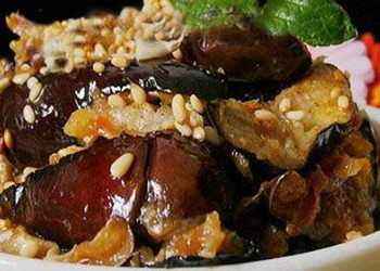 主料:長嫩茄子400克。 配料:松籽50克,濕淀粉10克,色拉油750克。 調(diào)料:碘鹽5克。味精4克,白糖10克,醋5克,醬油6克,蔥丁3克,姜末3克,蒜片3克,湯75克。 制作: (1)茄子去蒂洗凈去皮,一切兩半,再切十字花刀后,改成6厘米X6厘米的塊。 (2)勺內(nèi)放油,燒六七成熱,放入茄花炸成金黃色,撈出瀝油。 (3)勺內(nèi)留少許底油,燒三四成熱,放入松籽炒出香味,加蔥丁,姜末,蒜片,醬油,湯,鹽,味素,醋,糖,料酒,炸好的茄花,燒開,用濕淀粉勾芡, 點香油,裝盤即好。 |