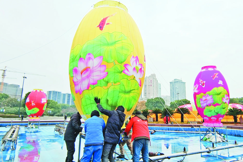 昨日,市區(qū)繡湖廣場(chǎng)噴泉水池內(nèi),燈展布展人員正在安裝高度約4.5米的“年年有余”燈飾,裝點(diǎn)新年喜慶氛圍。