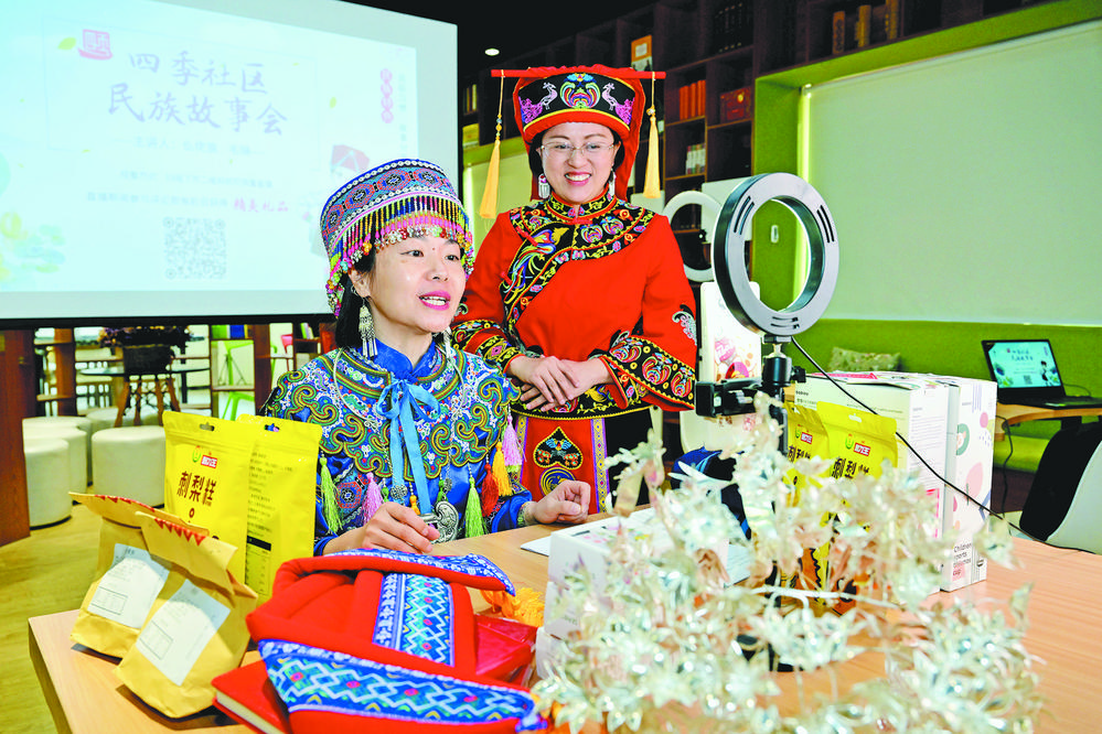 2月15日,在北苑街道四季社區(qū)民族故事會直播間里,來自湖南鳳凰古城土家族的滿付英和廣西羅城仫佬族的韋琳,身穿民族服飾,一邊講述當(dāng)?shù)毓?jié)日風(fēng)俗和美食,一邊向粉絲直播老家的土特產(chǎn)。 今年以來,北苑街道四季社區(qū)聯(lián)合民族團(tuán)結(jié)促進(jìn)會,積極探索以“教學(xué)+直播”、社區(qū)民族好物推薦官等培訓(xùn)模式,進(jìn)一步提高轄區(qū)少數(shù)民族群眾直播帶貨等新技能,探索創(chuàng)業(yè)共富新路徑。 |