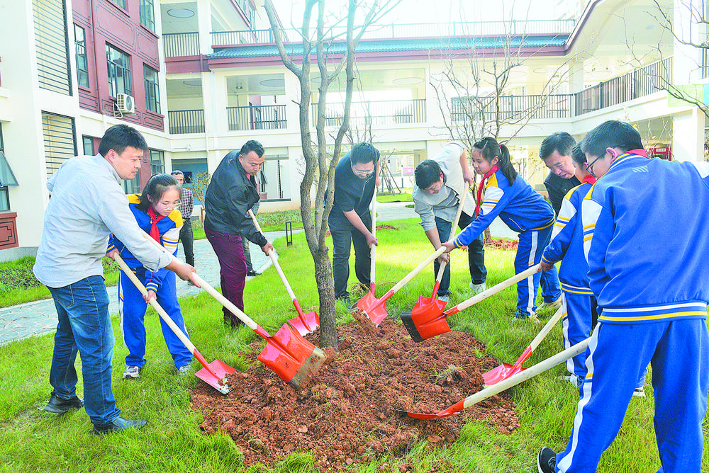 3月10日下午,一場以“棗樹回家文化傳承”為主題的植樹活動在福田二小勞動實踐園舉行。 蜜棗是義烏三寶之一,福田街道曾是義烏棗的重要產(chǎn)地,福田二小周邊的江村、杏園等村社世代種棗樹,學(xué),F(xiàn)址原先也是一片棗林。為了傳承義烏棗文化,福田二小和福田街道興隆社區(qū)共同策劃了本次活動。揮鍬鏟土、扶樹填土、提水澆灌……社區(qū)工作人員與學(xué)校師生代表共同種下了一批棗樹,孩子們還將自己親手制作的卡片掛上枝頭,許下美好心愿,期待早日豐收。 |