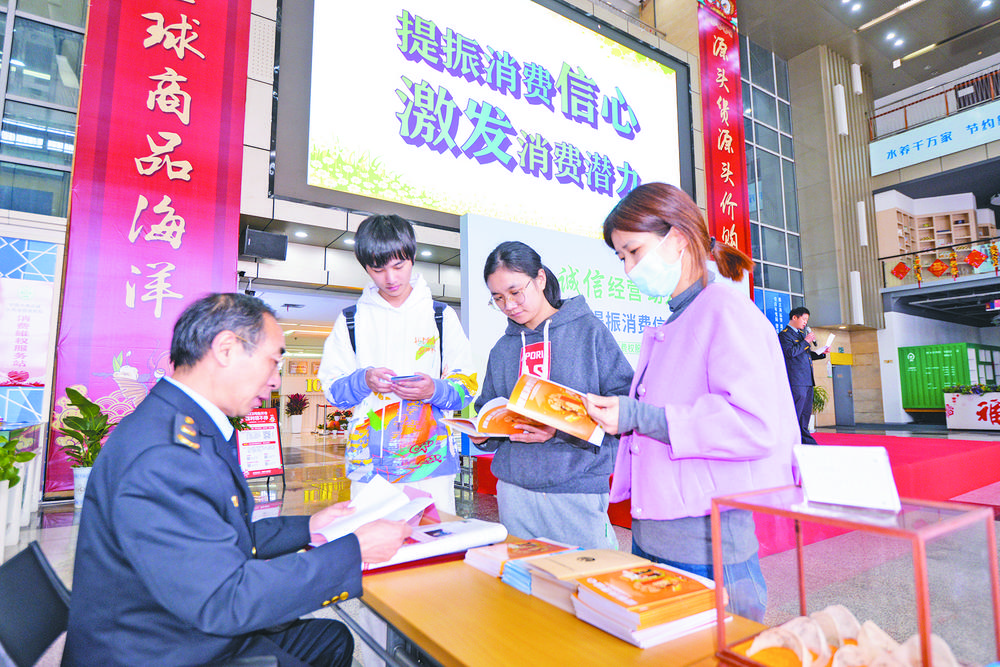 昨日,“3·15”進市場系列活動在國際商貿(mào)城舉行,市場監(jiān)督管理局中國小商品城分局、商城集團國際商貿(mào)城第五分公司為市場“消費者信得過單位”授牌,并舉行“義務維權服務隊”新成員入隊儀式。圖為市場監(jiān)督管理局工作人員為消費者發(fā)放宣傳折頁。