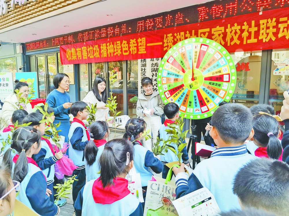 近日,繡湖社區(qū)攜手繡湖小學(xué),舉行“收集有害垃圾,播種綠色希望”家校社聯(lián)動(dòng)活動(dòng);顒(dòng)現(xiàn)場(chǎng),社區(qū)工作人員詳細(xì)講解垃圾分類知識(shí),并寓教于樂,通過“垃圾分類大轉(zhuǎn)盤”游戲,檢驗(yàn)小學(xué)生對(duì)垃圾分類了解程度。此外,孩子們還拿出過期藥品、廢電池、廢燈管等有害垃圾,進(jìn)行垃圾分類投放,正確完成后,從工作人員處換取一株綠油油的柑橘苗。 |